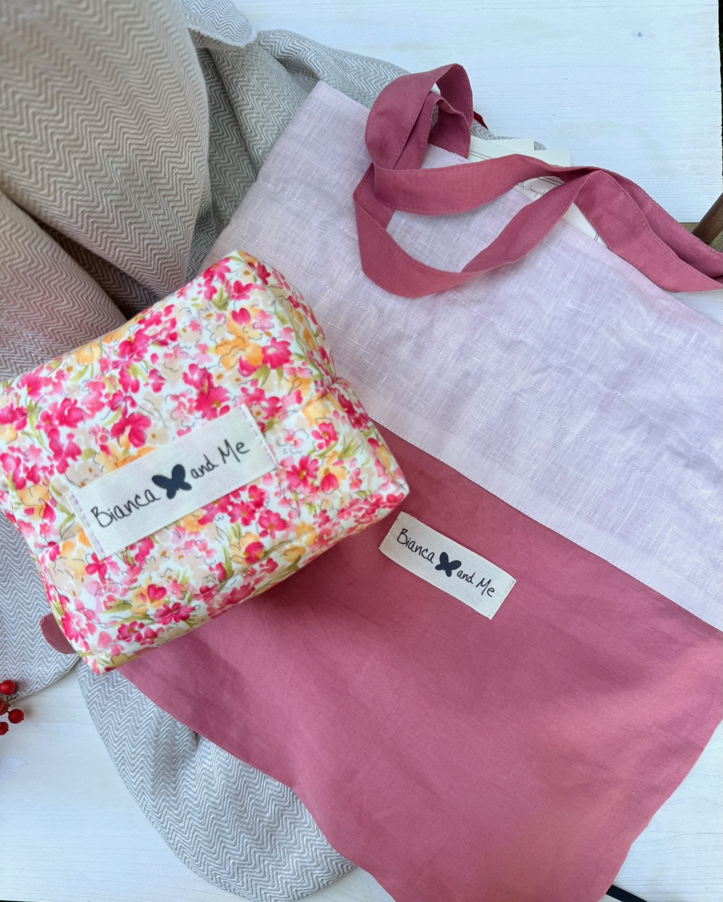 Capiente shopper in doppio lino, creata per Bianca and Me, con logo.